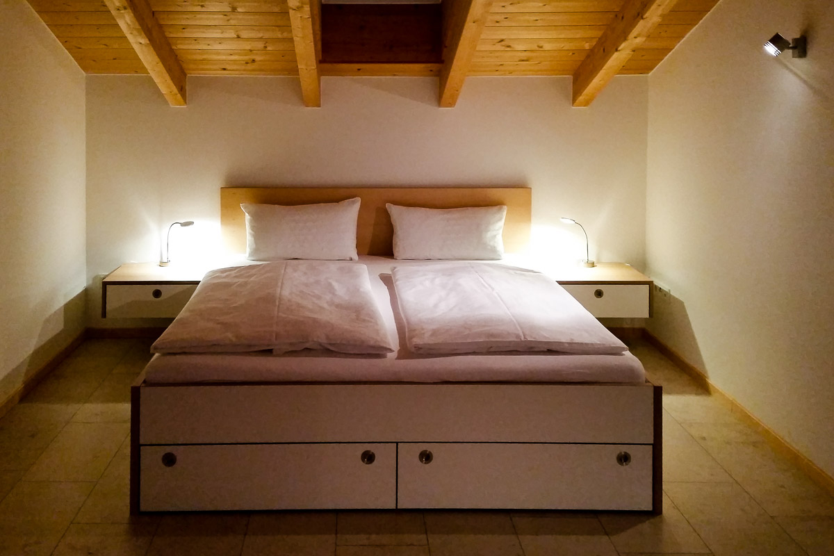 Das Schlafzimmer mit Doppelbett, ausgestattet mit einer hochwertigen Qualitätsmatratze, bietet auch für Allergiker einen guten Komfort. Bei Bedarf kann ein Kinderbett dazugestellt werden. Ein begehbarer Kleiderschrank bietet zusammen mit einem eingebauten Schrank im Schlafzimmer genügend Platz für Ihre Kleidung. Als Besonderheit bietet sich der Blick aus dem Dachfenster auf den Sternenhimmel.