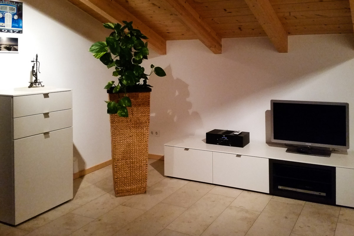 Ein großes Wohnzimmer mit bequemer Sitzgruppe lädt am Kaminofen zu gemütlichen Abenden ein. Natürlich ist Sat-TV, DVD - Player und eine Musikanlage vorhanden. Ein Internetanschluss, bei Bedarf auch WLAN steht zur Verfügung.
